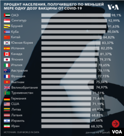 В десятку стран по масштабам вакцинации также вошли Португалия, Чили, британские Каймановы острова, Сингапур, Мальта, Китай и Камбоджа. В Соединенных Штатах процент тех, кто получил по меньшей мере одну дозу, превышает 71%.России процент сделавших прививку составил 46,98%; в этом рейтинге страна находится между Сербией и Парагваем.
